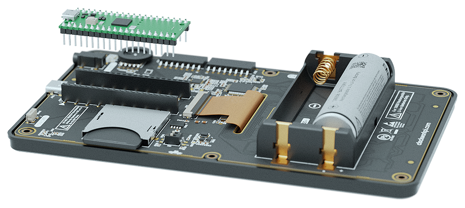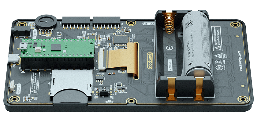 ClockworkPi v2.0 supports the Raspberry Pi Pico H/ Pico WH series and various compatible modules. CPI 2.0 features an SPI screen, SD card slot, integrated onboard 8MB PSRAM, dual PWM speakers, 3.5mm phone jack and 18650 lithium battery charge & discharge management, providing the system with ultra-long battery life.