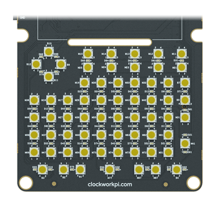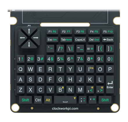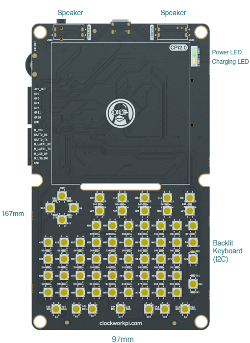ClockworkPi v2.0 also includes an STM32 chip (similar to the south bridge) to provide a QWERTY keyboard module with I2C interface, and manage the backlight of the screen and keyboard, power management etc., helping you simplify development, focus on application development and save IO resources.